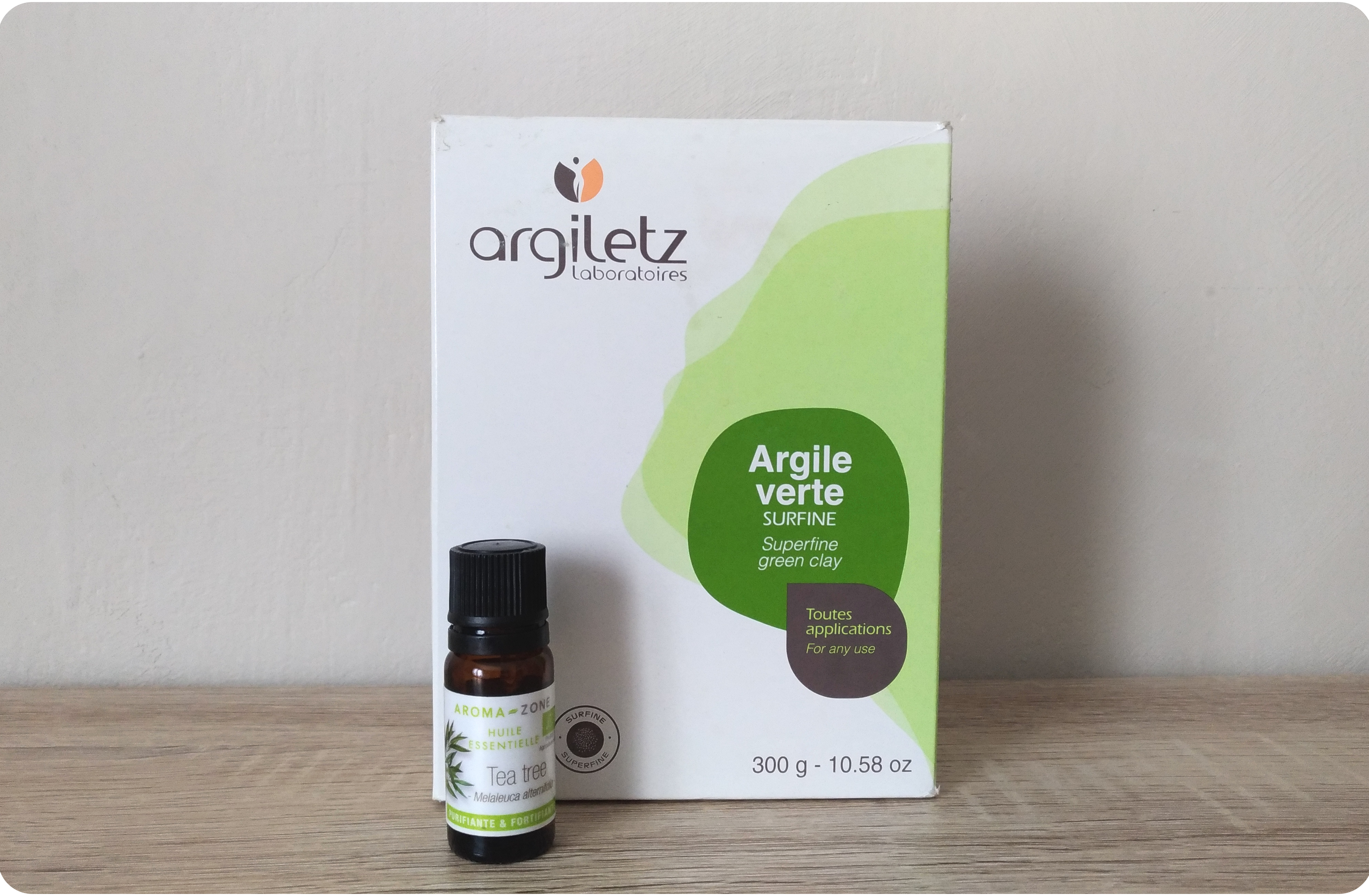 - Argile verte et huile essentielle de tea tree (d’arbre à thé)