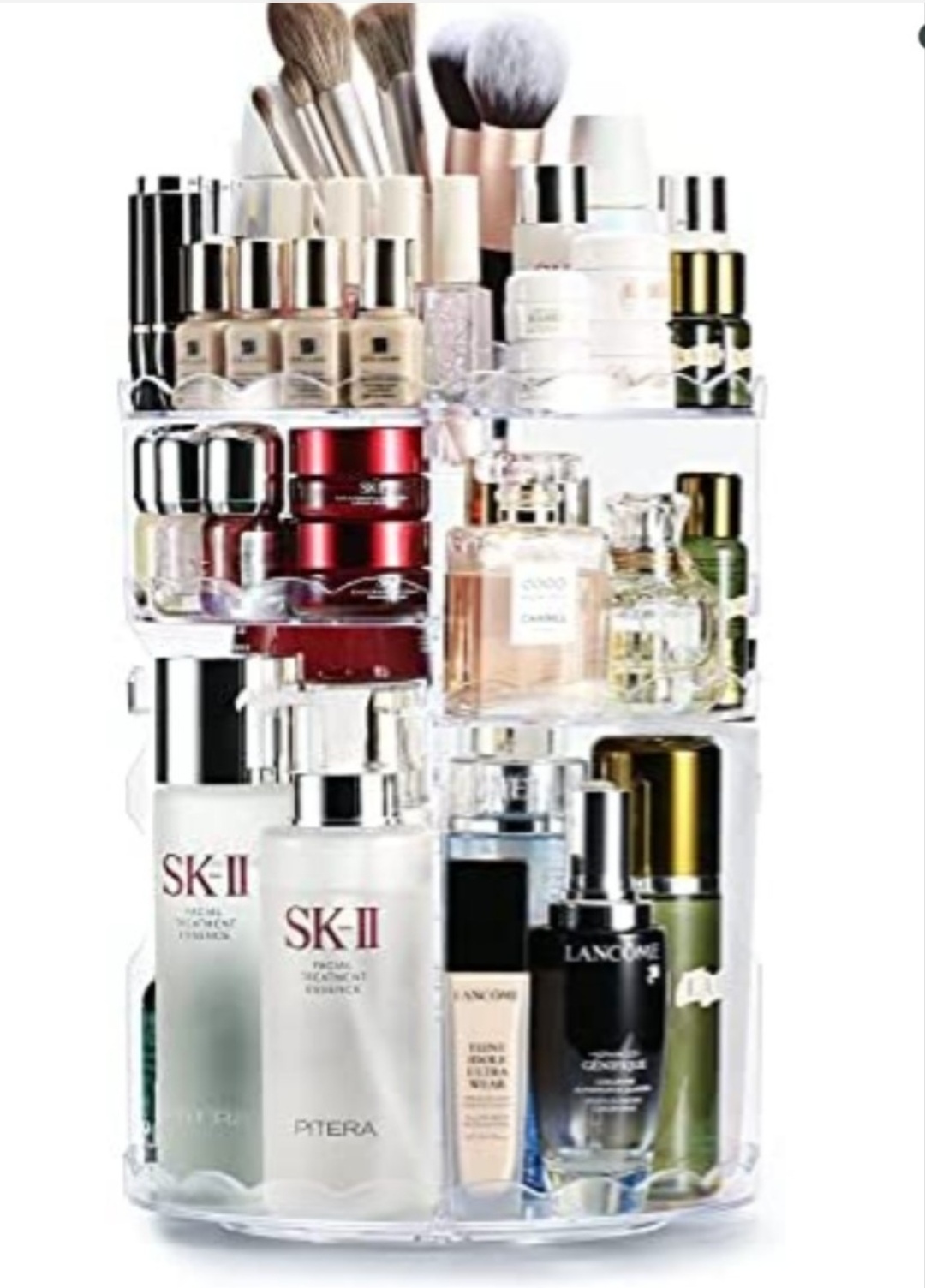 Etant une grande consommatrice de skincare, j’ai beaucoup de produit et par forcement de rangement adapté pour tout ranger. Je souhaitai un rangement qui me permette d’accéder facilement à mes produits de soins. J’ai donc investi dans cette tour de rangement rotative. Elle arrive en kit et se monte très facilement, on peut ajuster la taille des étages pour pouvoir mettre des grands flacons par exemple. Il existe plusieurs coloris mais je l’ai choisi en plastique transparent.