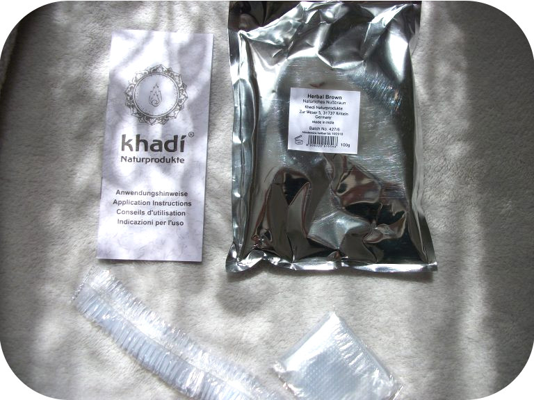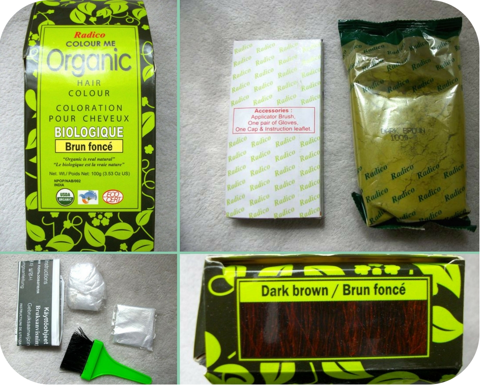 J’ai choisi la teinte brun foncé Le kit est complet et contient une notice, une charlotte, des gants et une brosse d’application, le sachet contient 100g de poudre. Le mélange se compose de poudre tinctoriale et de poudre ayurvédique et contient de l’indigo, de l’amla de manjistah, de l’hibiscus, du henné, du bhringraj et du fenugrec.