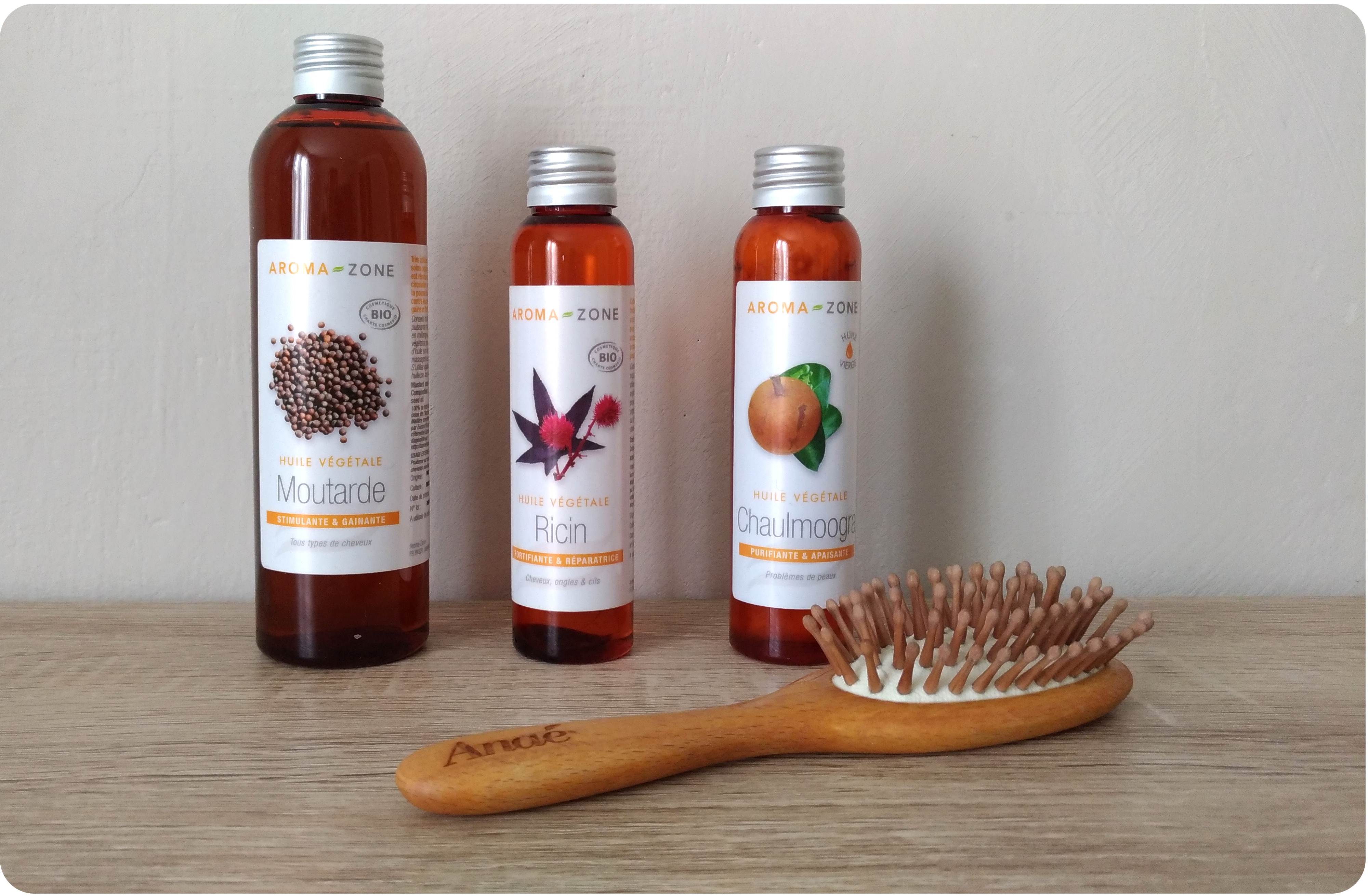 Pour cela, j’utilise des huiles différentes. Pour le cuir chevelu : huile de moutarde et ricin ou chaulmoogra, ça dépend.