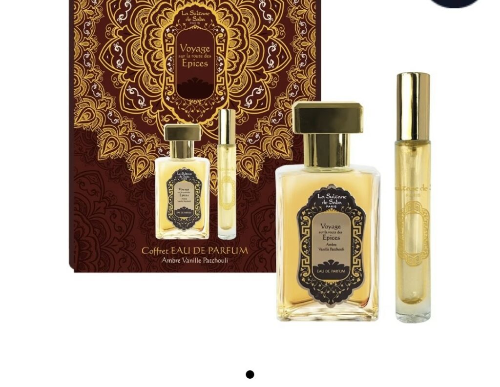 –Coffret parfum ambre, vanille et patchouli de La Sultane de Saba : Ce coffret contient une eau de parfum 50 ml et un vaporisateur de sac de 10 ml. Il plaira à toutes les amatrices de parfums orientaux aux notes de rose, santal, vanille et tonka.
