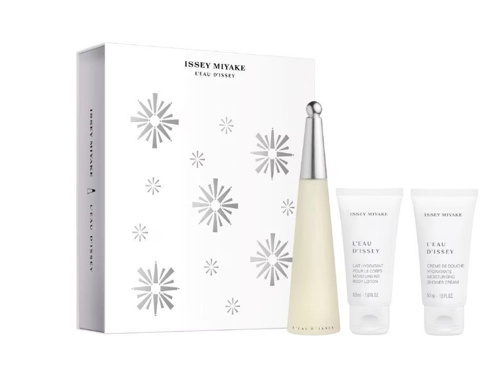 – Coffret L’eau d’Issey : Ce parfum floral aquatique aux notes plus fraîches ( rose, lys, lotus fleurs fraiches et bois précieux) fera un très beau cadeau. Le coffret contient une eau de parfum, un gel douche et un lait pour le corps en format 50 ml.