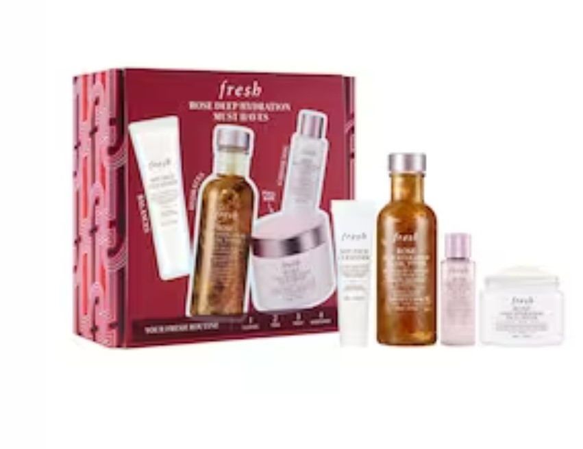 Coffret de soin hydratant Fresh*: Une autre marque que j’aime beaucoup, avec des produits efficaces et agréables à utiliser. Vous trouverez dans ce coffret une routine complète. Avec le fameux nettoyant au soja, qui est vraiment très doux pour la peau. Mais aussi le toner à la rose, le sérum et la crème de la gamme Rose. Si vous ne connaissez pas encore cette marque, c’est le moment de l’essayer.