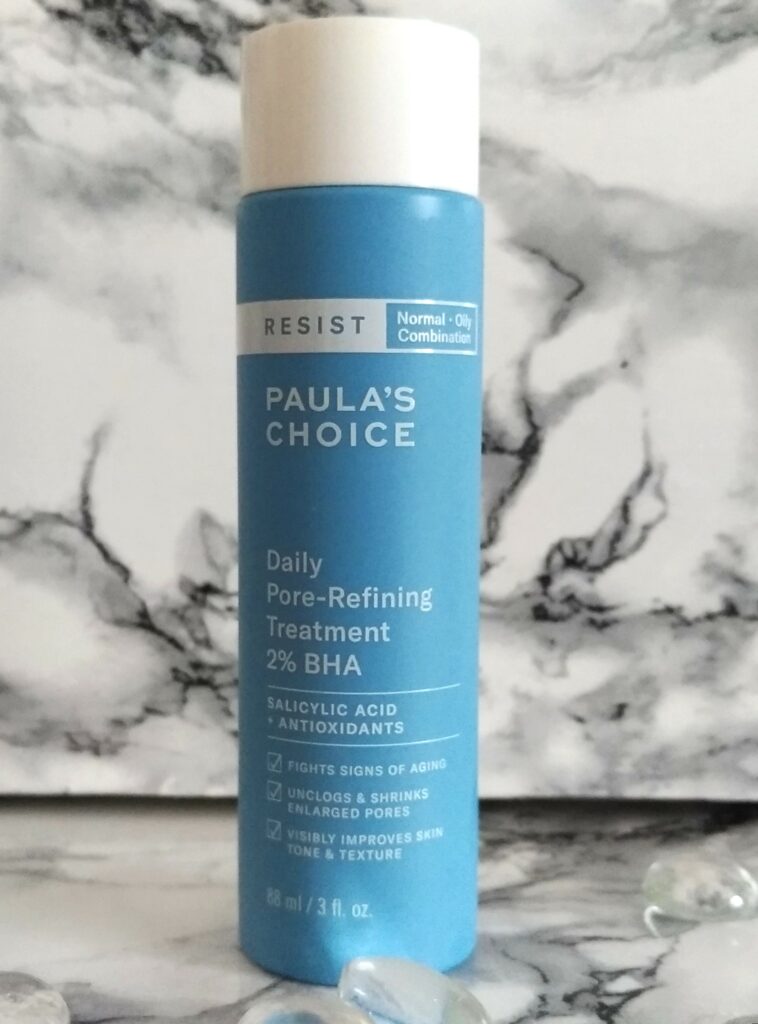 Avant d’opter pour celui-ci, j’avais essayé l’exfoliant liquide 2% BHA, le best-seller de la marque. Mais je n’aime pas du tout le fini un peu gras qui laisse sur la peau. J’avais besoin d’un soin exfoliant avec un fini un peu plus léger. C’est le cas de cette lotion quotidienne pour resserrer les pores. Elle contient aussi 2% de BHA. L’effet est identique que celle du flacon gris, la taille des pores est réduite et la peau a plus d’éclat.