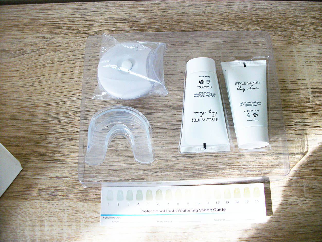 Le kit comprend une gouttière, un activateur lumineux et deux tubes de gel pour 2 traitements et également un nuancier.