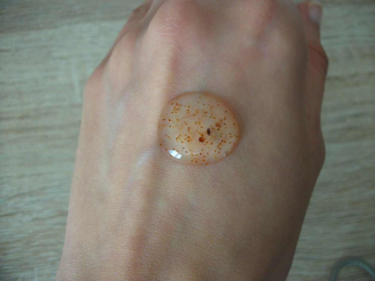 C’est un gel huileux avec des petits grains de différentes tailles à base d’arnica BIO et d’akènes de fraises (ce sont les petits grains sur les fraises).