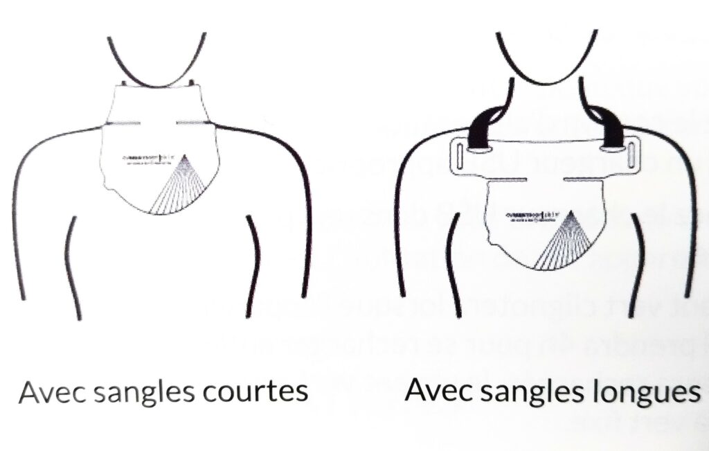 Il peut être placé de 2 différentes façons comme le montre le schéma juste en dessous. Le masque s’utilise avec une batterie portable et la séance dure 10 minutes. Tout comme les deux premiers masques Led, il s’éteint tout seul dès que la séance est fini.
