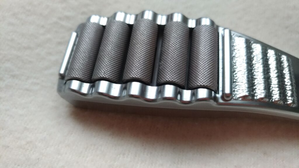 Cet outil se compose de cinq rouleaux avec une texture très particulière, une sorte de quadrillage en relief.
