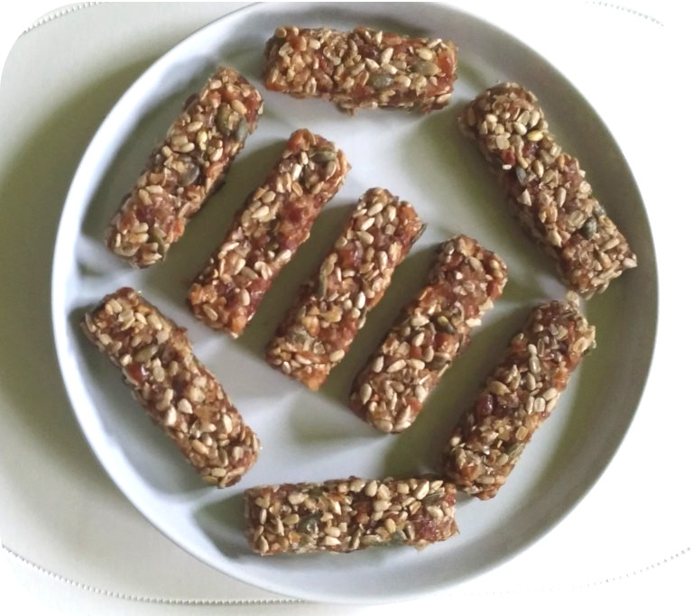 Tout d’abord j’ai dénoyauté et nettoyé les dattes avec un chiffon humide. Ensuite j’ai mis les graines à torréfier légèrement, sur une poêle à feu moyen. Cela va apporter du croquant et je trouve que ça rend les graines plus digestes. Ensuite, je mixe les dattes jusqu’à l’obtention d’une texture hachée, puis je mélange avec les graines à la main. Je n’ajoute pas de sucre, les dattes en contiennent déjà naturellement.