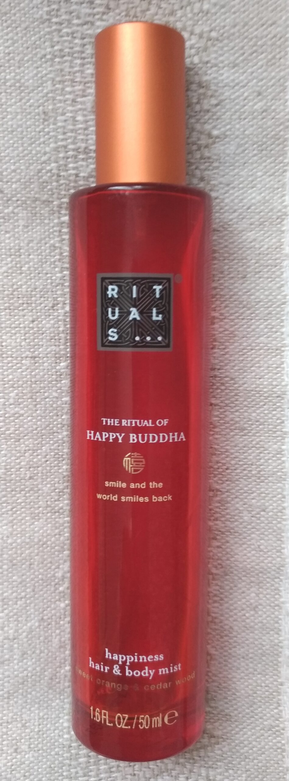 Pour un effet stimulant et énergisant j’utilise la brume de chez Rituals, The Ritual of happy Buddha. Elle contient des extraits d’orange douce, ça me donne vraiment un coup de peps avant ma séance.