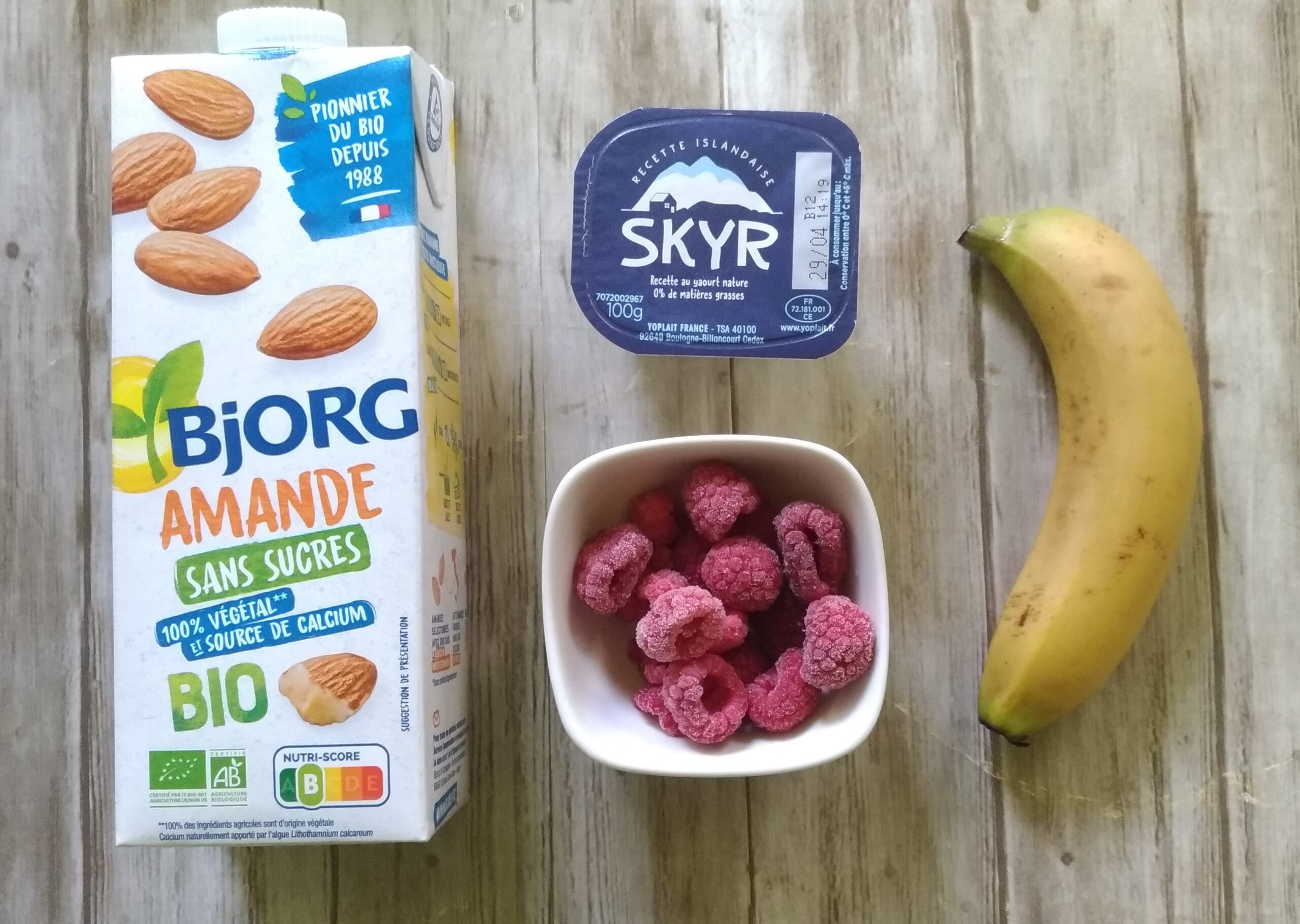 Après ma séance, j’aime bien me faire un smoothie avec des protéines, et pour cela, j’utilise: du lait d’amande, (lait d’amande Bjorg sans sucres) une banane, des framboises surgelés et du yaourt skyr (disponible en grande surface). C’est un yaourt que j’ai découvert récemment, il contient beaucoup de protéines et contient 0% de matière grasse.