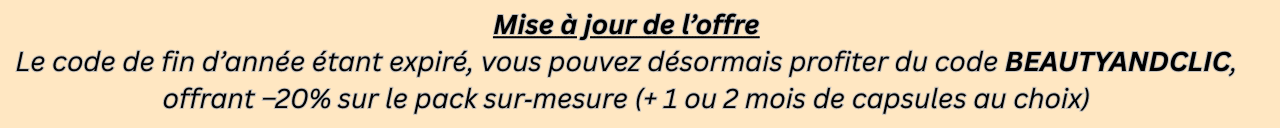 Et si vous avez envie de tester le Lightinderm à votre tour, c’est le moment ou jamais : Du 7 novembre au 31 décembre, profitez de -25 % sur l’appareil + 1, 2 ou 3 mois de capsules au choix, selon le programme qui vous correspond. C’est la plus belle offre de l’année, accessible grâce à mon code promo BEAUTYANDCLIC25. Une occasion en or pour intégrer le biohacking cutané dans votre routine beauté, révéler le meilleur de votre peau et stimuler efficacement le renouvellement cellulaire.