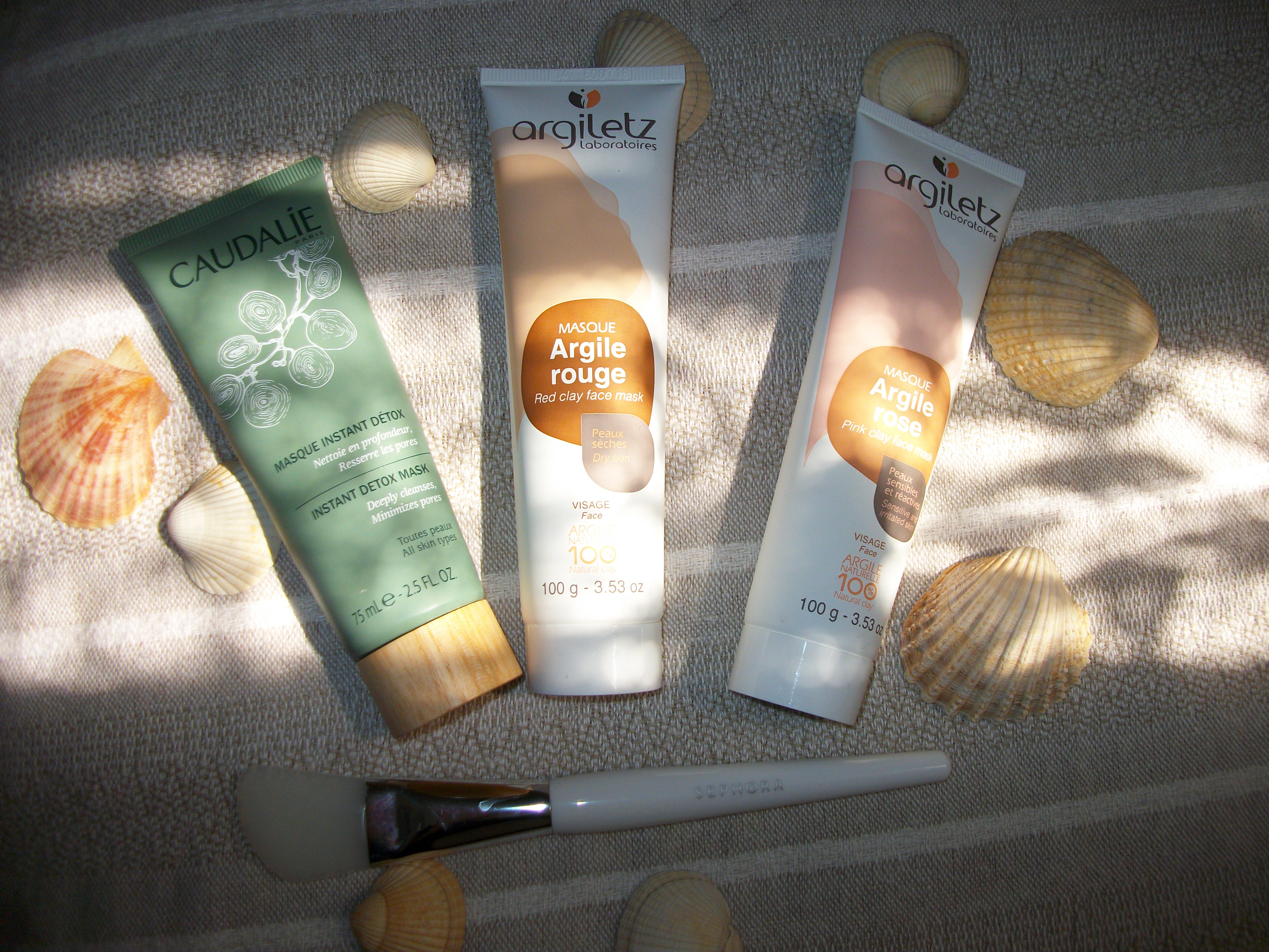 (Caudalie masque instant détox, Argiletz masque argile rouge, Argiletz masque argile rose, pinceau spatule masque Sephora)